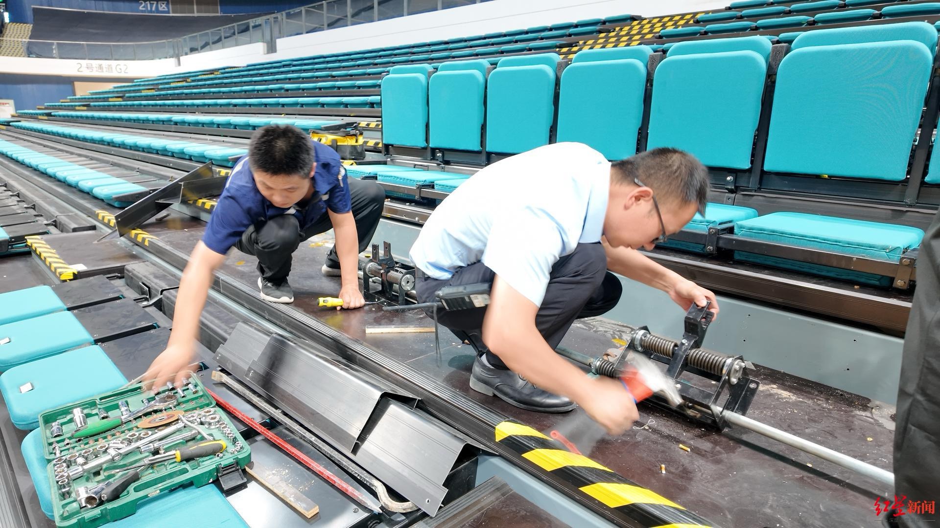 成都高新体育中心全民健身馆,现场施工人员正在一个个玻璃格子中铺地板,另一边的观赛区域,施工人员正将一个个临时座椅安装到位。