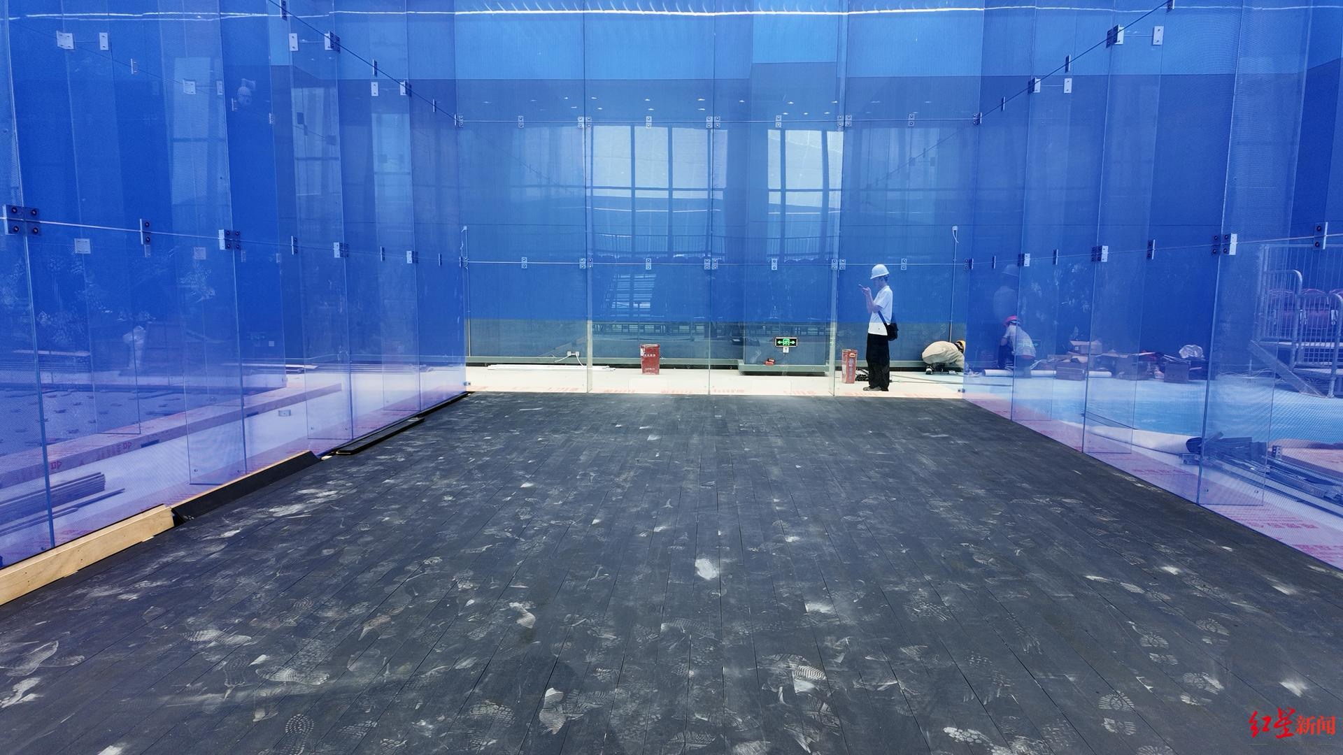 现场两个比赛场地的玻璃格子已经建设完成,其中壁球项目竞赛场馆正在进行最后的临时座椅安装工作;短柄墙球项目竞赛场馆则正在铺设竞赛区域的地板。