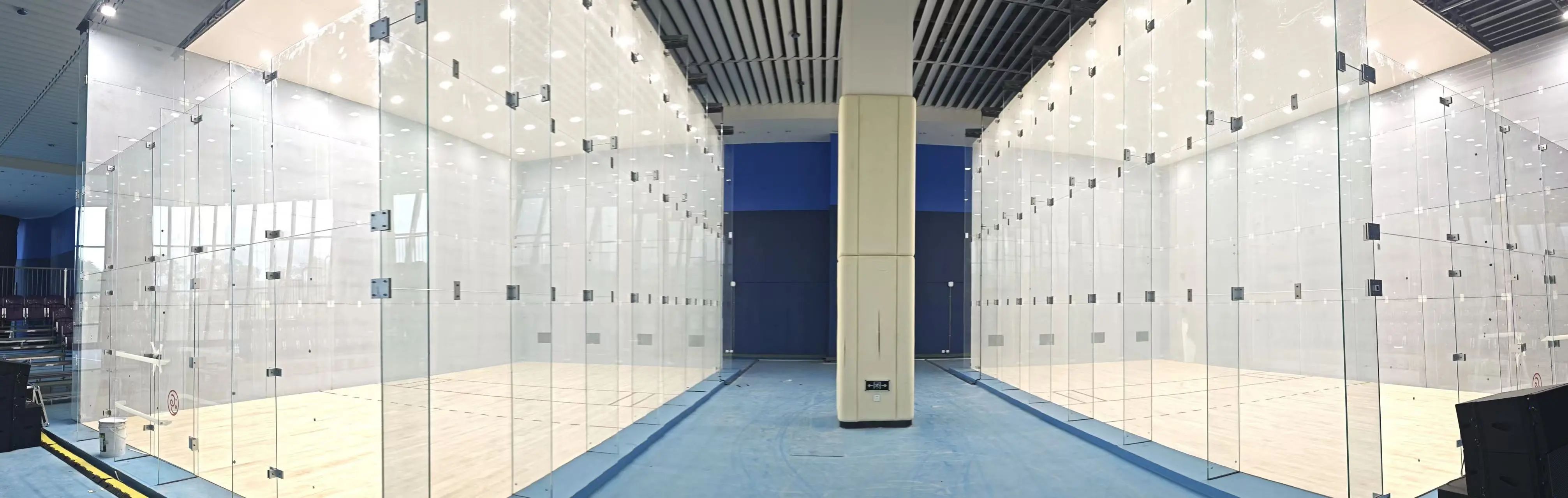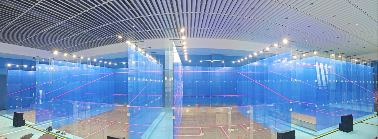 由于壁球和短柄墙球均在透明玻璃格子中进行,场馆改造着重于标准玻璃格子建设、临时座椅安装及灯光照明系统升级。目前,比赛场地的玻璃格子、临时座椅均已搭建完毕,短柄墙球项目竞赛场馆竞赛区域地板、顶棚、照明设备等也已搭建完成。