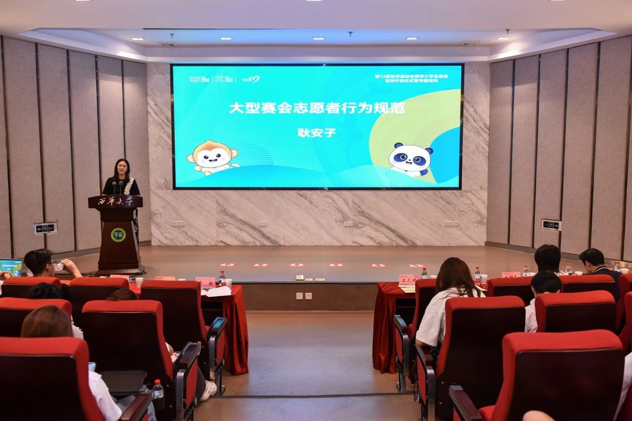 6月17日启动培训,成都世运会执委会人力资源部(志愿者部)工作人员耿安子以“大型赛会志愿者行为规范”为主题,从岗位职责、跨文化沟通等维度构建服务标准框架,结合赛事引导、信息咨询等场景案例,强调“精准响应、主动关怀”的服务理念。