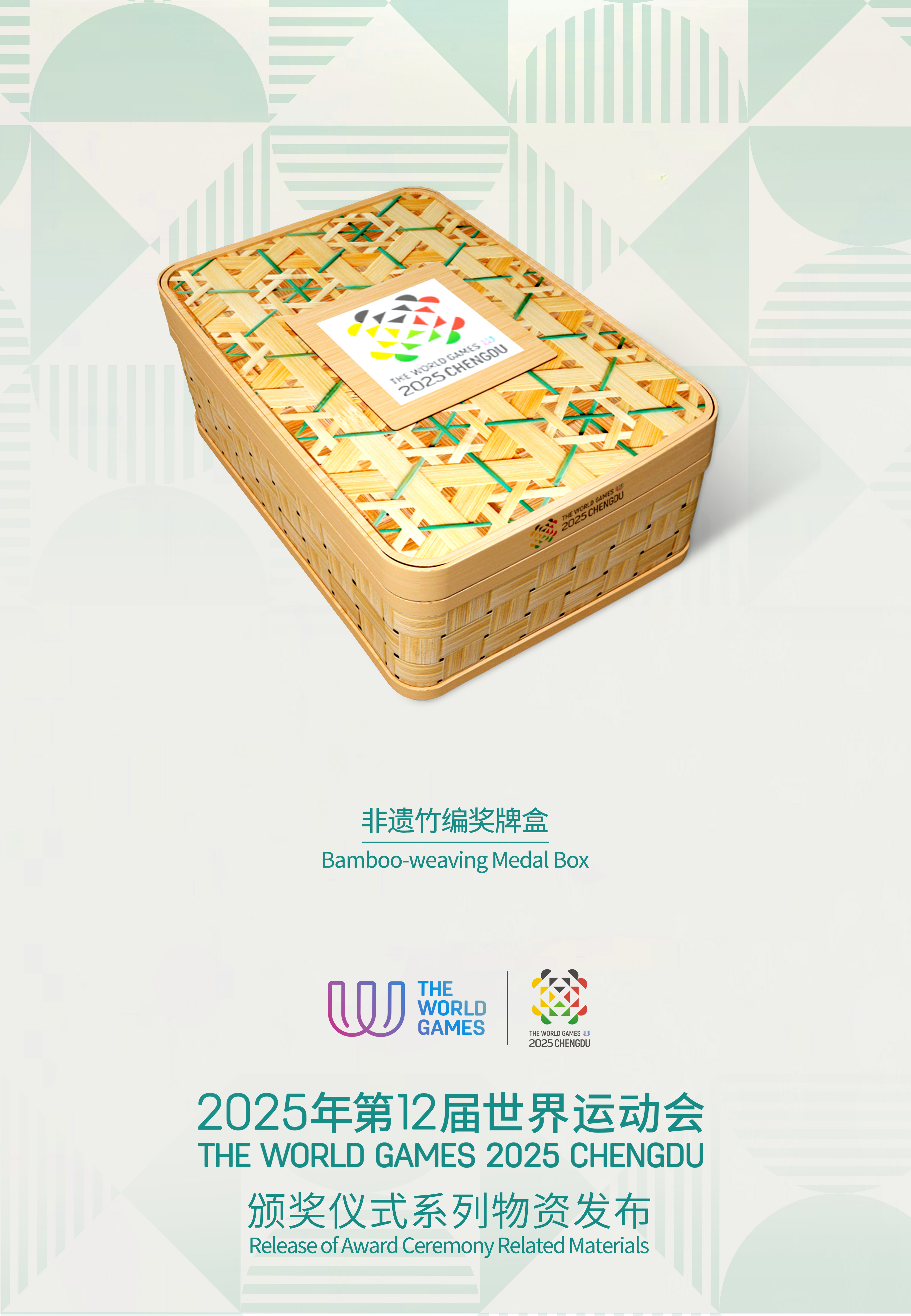 成都竹编源于战国,以瓷胎竹器闻名。奖牌包装盒充分挖掘传统非遗文化,以非遗竹编技艺手工编织,纵横竹篾织就“方圆周正”之型守护奖牌璀璨,跳色竹绿点缀如锦江春色。