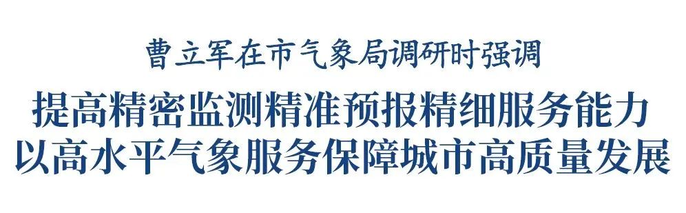 8月5日,省委常委、市委书记曹立军前往市气象局调研。他强调,要深入学习贯彻习近平总书记关于气象工作重要指示精神,全面落实党中央、国务院和省委、省政府部署要求,坚持靠前服务,注重协同联动,强化科技赋能,加快气象现代化建设,不断提高精密监测、精准预报、精细服务能力,以高水平气象服务保障城市高质量发展。
