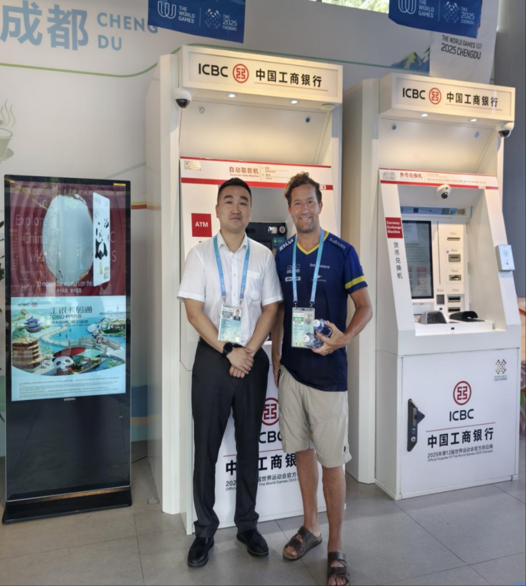 当天上午,世运村A区商业街的工商银行ATM机迎来首位境外客户,成功办理外卡取现业务。工行ATM机可受理银联、维萨(visa)、万事达(Mastercard)、美国运通(American Express)、大来和JCB在内的6种境内外主要卡组织银行卡。为了保障外币兑换,工商银行构建的24小时应急保障体系,确保了智能自助服务机具在业务高峰时段也能保持高效稳定运转,让"工行速度"与"成都温度"同步传递。