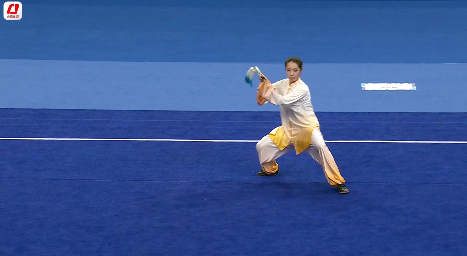 在晚上进行的太极剑比赛中,她第8个出场,最终以总分19.522分获得金牌。