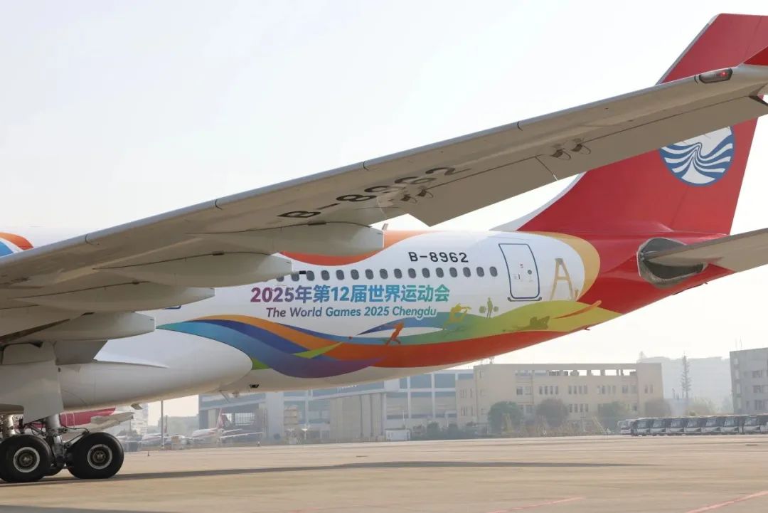 川航不仅肩负航空运输保障重任,更是向全球传递成都的热情与活力的文化传播者。今年,川航特别设计并喷涂2架“世运号”主题航班,机身以成都世运会主视觉为核心,融合吉祥物“蜀宝”“锦仔”及中国红、金沙黄等代表天府文化的色彩,成为穿梭云端的“空中城市名片”。
