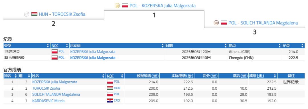 波兰队也收获两枚金牌,尤其耀眼的是,冠军尤利娅·科热尔斯卡创造了222.5米的世界新纪录。