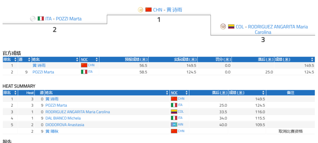 2009年出生的小将黄诗雨获得了残疾人自由潜水女子动态有蹼 FFS1-FFS2(重度肢体残疾-中重度残疾)金牌,成绩是149.5米。她说:“我在训练中也游出过这个成绩,因此对这枚金牌是有预想的。”
