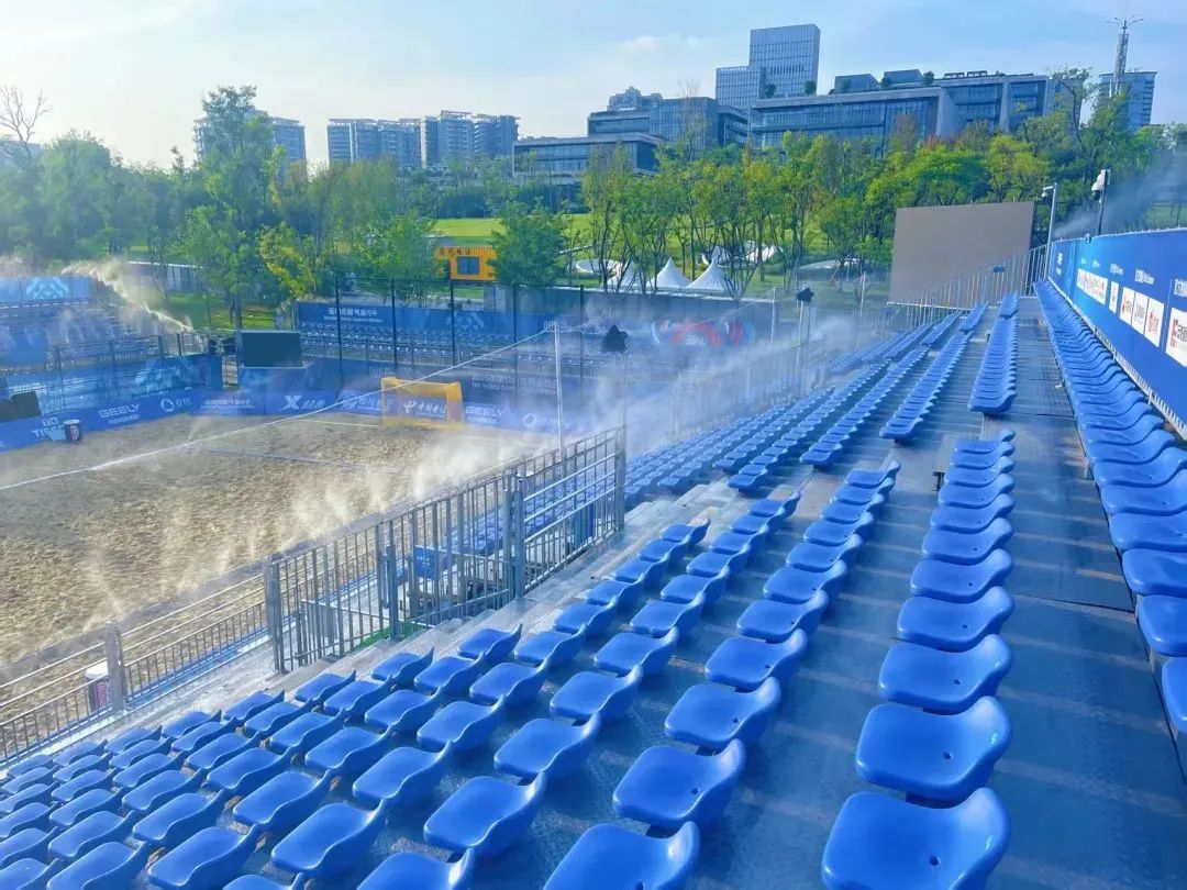 8月7日到12日,世运会沙滩手球项目比赛在兴隆湖沙滩赛场进行。赛场边,一排排均匀安放的降温喷雾装置将细密水雾喷洒到空中,为比赛现场带来清凉。