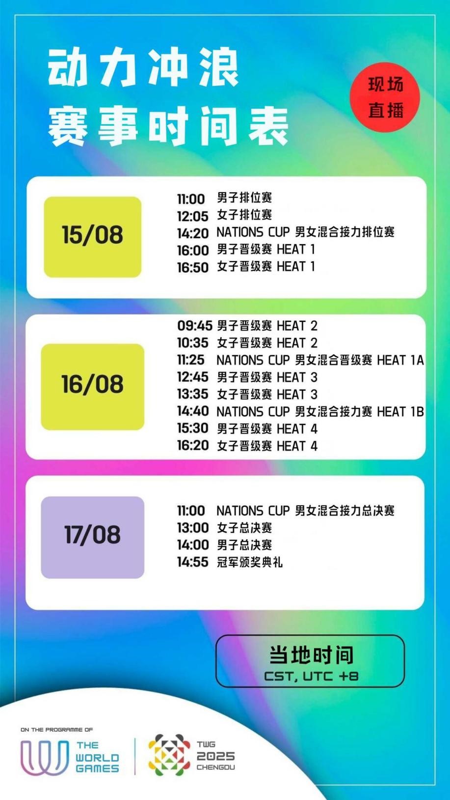 据世运会组委会消息,本次动力冲浪板比赛将在成都东部新区三岔湖国际水上运动中心举行,赛程为2025年8月15日至17日,设有男子组、女子组及三个小项。这是本届世运会摩托艇项目的唯一比赛。